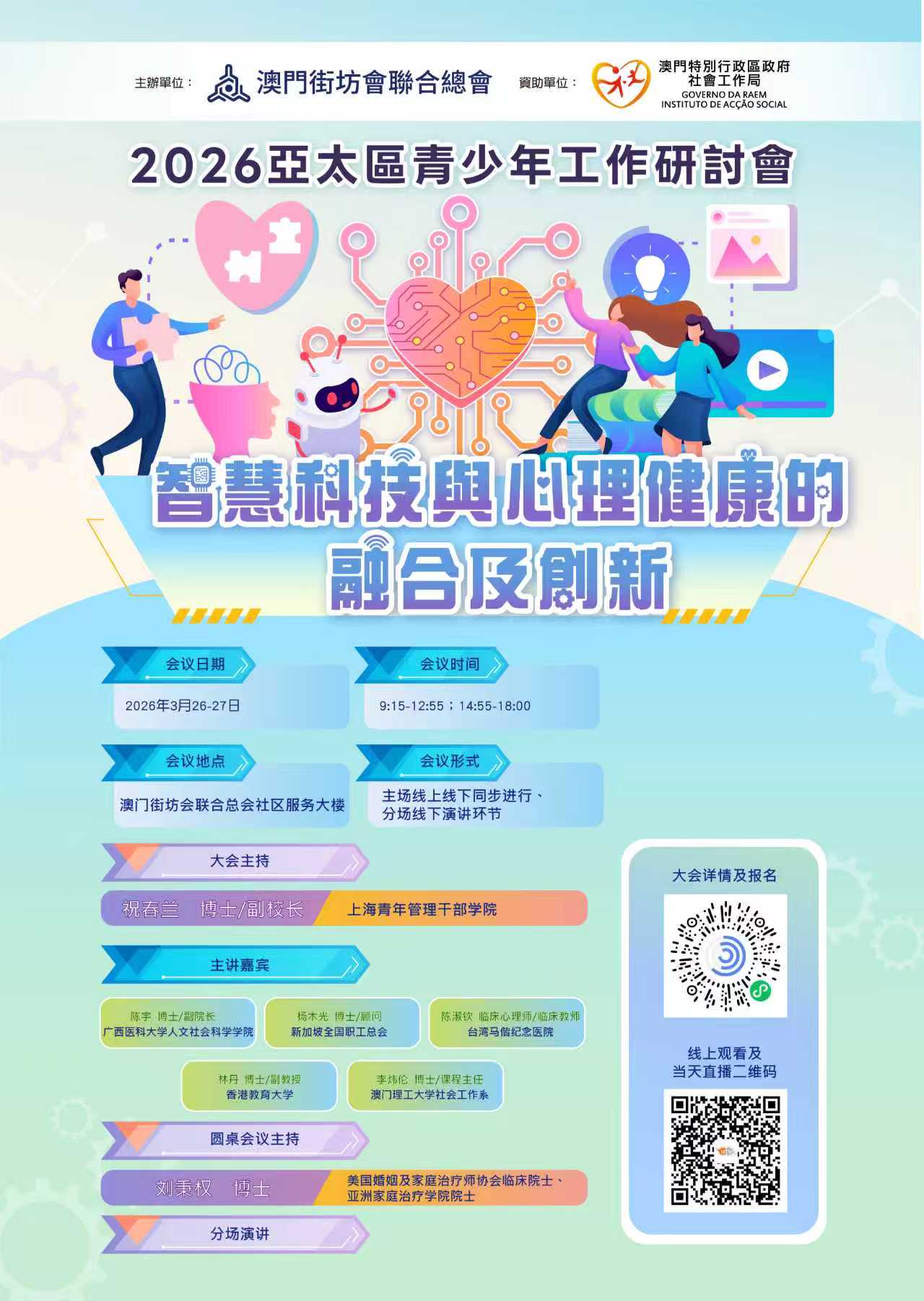 本次研讨会由澳门街坊会联合总会主办,聚焦人工智能时代背景下青少年成长新需求,汇聚内地及亚太地区相关领域专家、青少年工作者,共同探讨智慧科技与心理健康服务的创新路径,搭建跨区域交流合作平台。