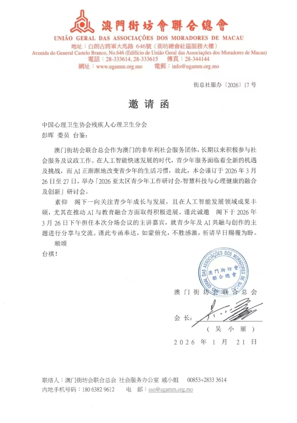 近日,以“智慧科技与心理健康的融合及创新”为主题的亚太区青少年工作研讨会在澳门成功举办。世界大健康运动联盟非遗专委会副会长、中国心理卫生协会残疾人心理卫生分会委员彭晖应邀出席本次会议,围绕非遗文化滋养青少年心灵、科技赋能心理健康服务等议题展开交流,为亚太地区青少年健康成长与文化传承事业建言献策。