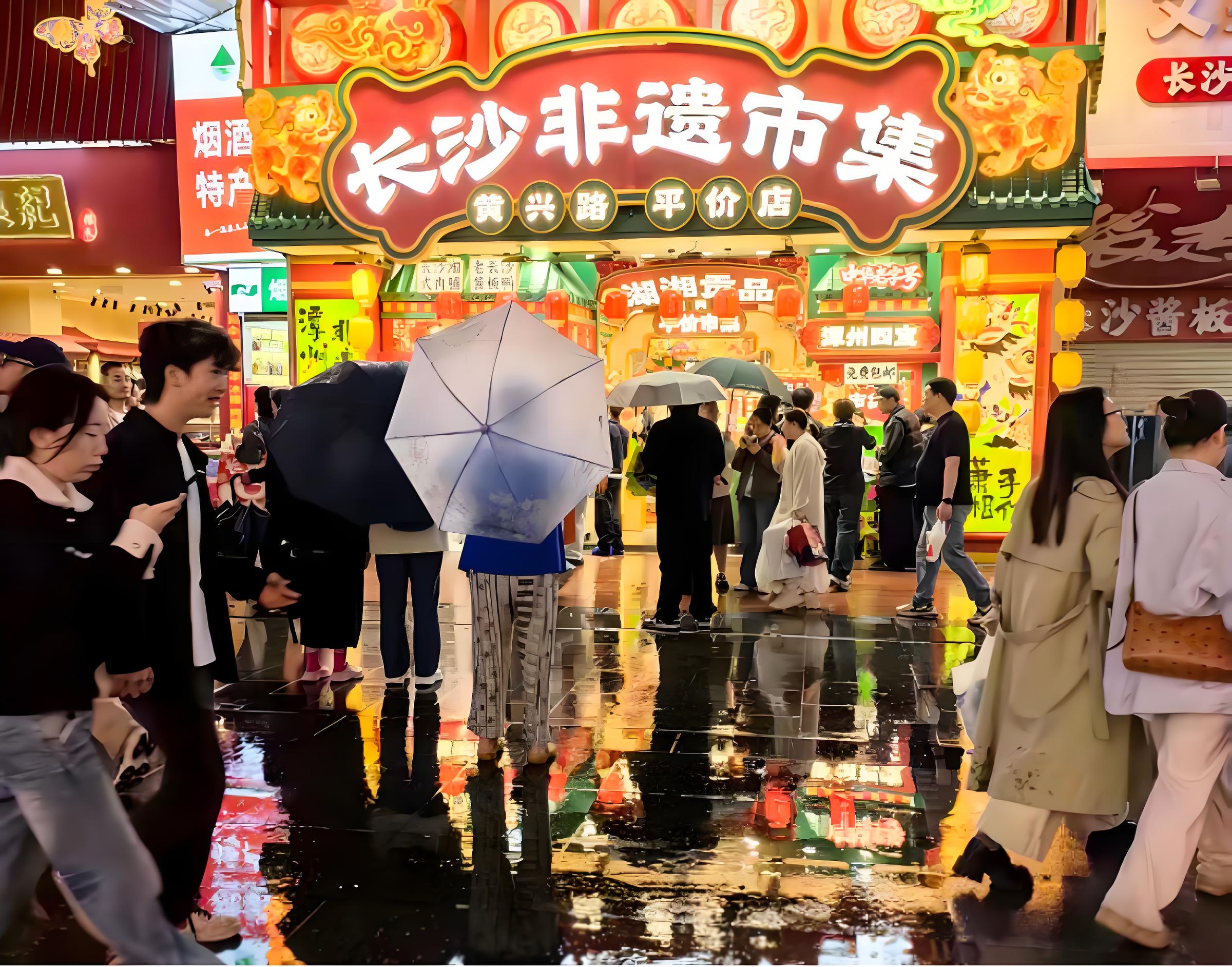 ↑与会代表冒雨参观考察长沙市黄兴路步行街项目。
