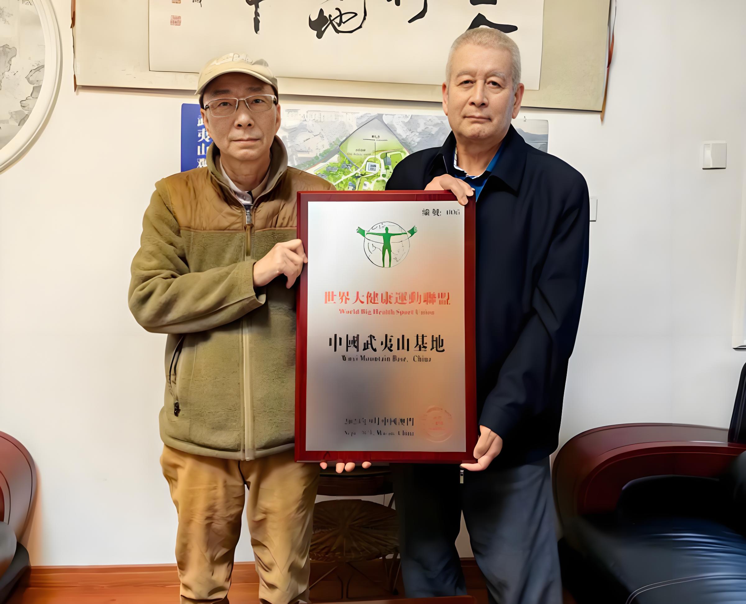 ↑郭周礼主席(右)为世界大健康产业联盟武夷山基地授牌。